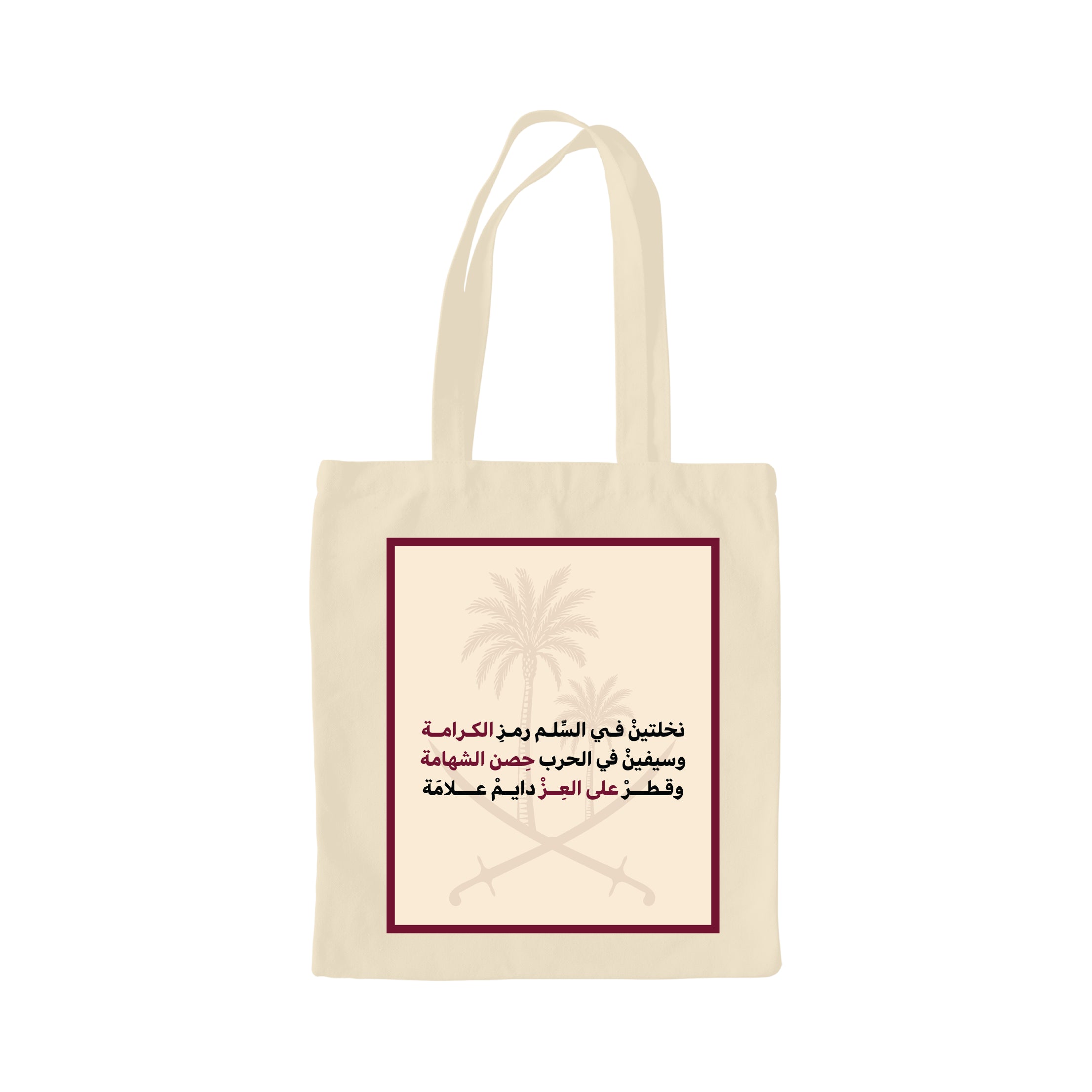 تتزيّن هذه الحقيبة الكلاسيكية بـ الشعار الوطني القطري الرسمي الطراز، متكامل العناصر مع الصقر والتاج والحصن التقليدي على خلفية قماشية أنيقة وهادئة.